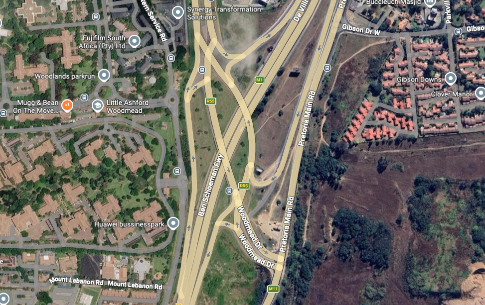 A modified version of a diverging diamond interchange is already in operation in Johannesburg; at the intersection of R55 Woodmead Drive and the M1, south of the Buccleuch Interchange. Here's what that looks like.