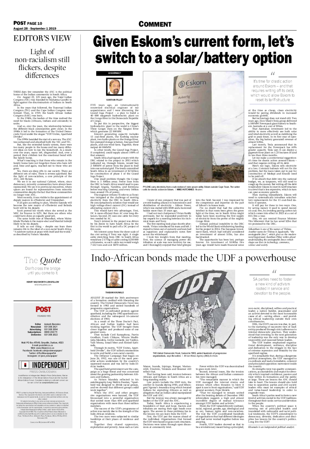 I’ve no doubt that had the collective intellect in that room been given the green light at that time, we in South Africa might today have been receiving the first supply of electricity from the power of the mighty Congo River.