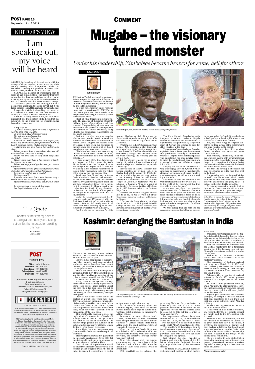 That friendship led to Moodley being the first person to come to mind when Mugabe created the country’s first Ombudsman — a high ranking post pioneered by the government of Norway and existing in very few other countries at the time.