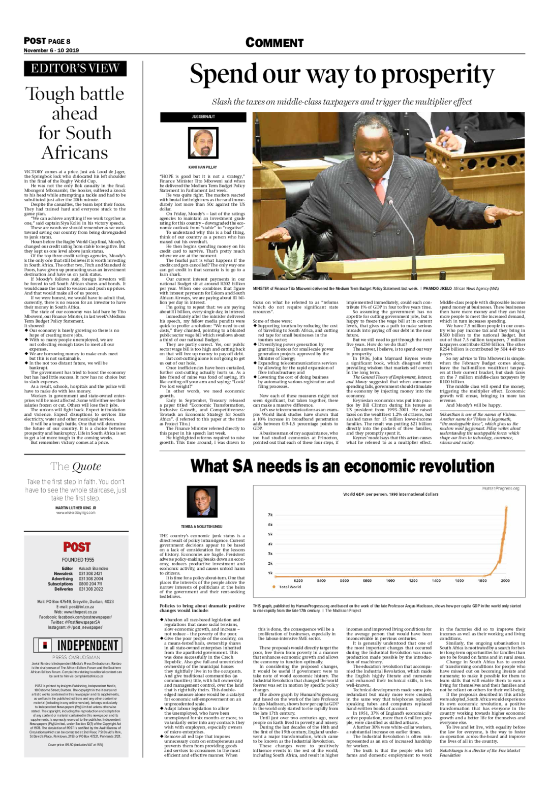 So my advice to Tito Mboweni is simple: when the February budget comes along, leave the half-million wealthiest taxpayers at their current bracket, but slash taxes on the 7 million middle class taxpayers by R100 billion.